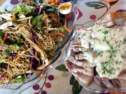 맛있어요 위엔 마늘이랑 우유로 갈릭소스 만들었어요 ㅎ 쟁반국수와 함께 환상궁합!!