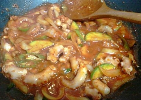 낙지볶음이예요 ㅎㅎ 밥에도 비벼먹고 팬에 남은 양념에 김가루 김치너코 밥 비벼먹으면 환상