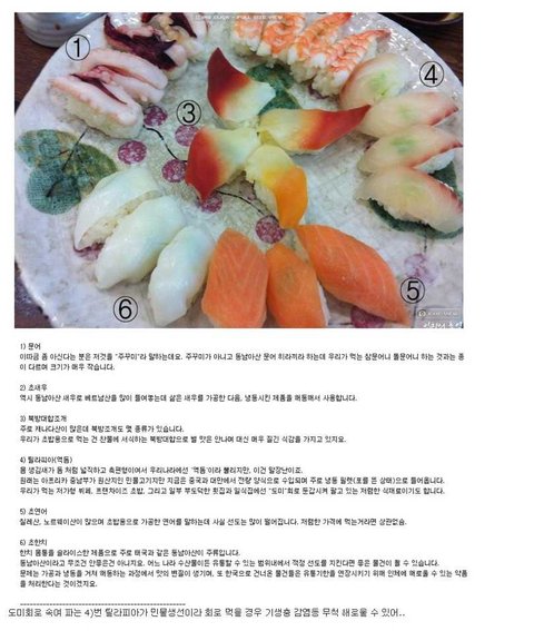 1) 문어 이따금 좀 아신다는 분은 저것을 "주꾸미"라 말하는데요. 주꾸미가 아니고 동남아산 문어 히라끼라고 하는데 우리가 먹는 참문어니 돌문어니 하는 것과는 종이 다르며 크기가 매우 작습니다. 2) 초새우 역시 동남아산 새우로 베트남산을 많이 들여놓는데 삶은 새우를 가공한다음, 냉동시킨 제품을 해동해서 사용합니다. 3) 북방대합조개 주로 캐나다산이 많은데 북방조개도 몇 종류가 있습니다. 우리가 초밥용으로 먹는건 찬물에 서식하는 북방대합으로 별 맛은 안나며 대신 매우 질긴 식감을 가지고 있지요. 4) 틸라피아(역돔) 몸 생김새가 돔처럼 넓직하고 축편형이어서 우리나라에선 "역돔"이라 불리지만 이건 말장난이죠. 원래는 아프리카 중남부가 원산지인 민물고기지만 지금은 중국과 대만에서 전량 양식으로 수입되며 주로 냉동필렛(포를 뜬 상태)으로 들어옵니다. 우리가 먹는 저가형 뷔페, 프랜차이즈 초밥, 그리고 일부 부도덕한 횟집과 일식집에선 "도미"회로 둔갑시켜 팔고 있는 저렴한 식재로 이기도 합니다. 5) 초연어 칠레산, 노르웨이산이 많으며 초밥용으로 가공한 연어를 말하는데 사실 선도는 많이 떨어집니다. 저렴한 가격에 먹는거라면 상관없슴. 6) 초한치 한치 몸통을 슬라이스한 제품으로 주로 태국과 같은 동남아산 주류입니다. 동남아산이라고 무조건 안좋은건 아니지요. 어느나라 수산물이든 유통할 수 있는 범위내에서 적정 선도를 지킨다면 좋은 물건이 될 수 있습니다. 문제는 가공과 냉동을 거쳐 해동하는 과정에서 맛의 변질이 생기며, 또 한국으로 건너온 물건들은 유통기한을 연장시키기 위해 인체에 해로울 수 있는 약품을 처리한다는 것이겠지요. -------------------------------------- 도미회로 속여 파는 4)번 틸라피아가 민물생선이라 회로 먹을 경우 기생충 감염등 무척 해로울 수 있어...