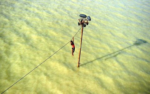 17. 갠지즈강 홍수로 솟아오르는 물을 피해 전선에 매달린 인도 청년