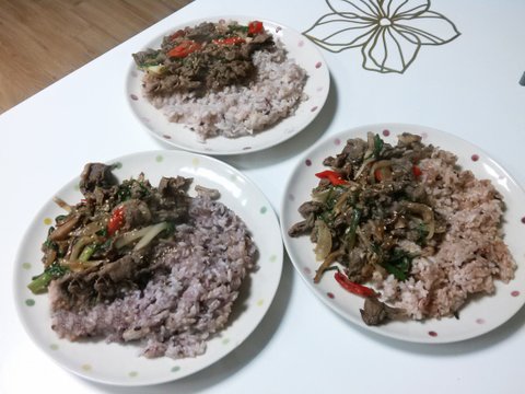 오른쪽 아래 밥의 색이 다른 이유는.. 헌밥이기 때문이에요ㅋㅋㅋ저건 제 거.