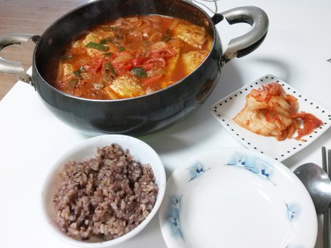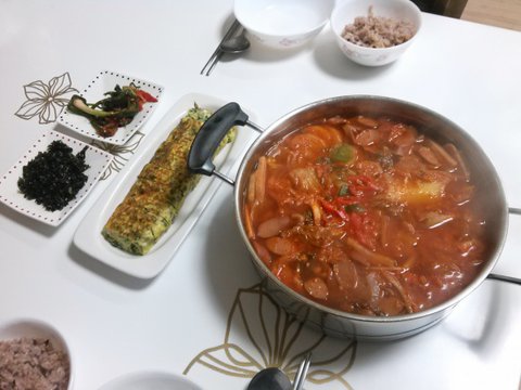 엄마 오셨을 때 부대찌개랑 같이 점심 간단하게 먹었어요. :)