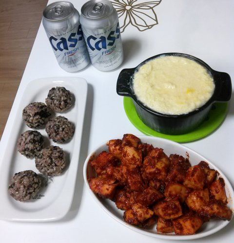 이것도 역시 축구 친선경기 볼 때 만들어먹은 불닭, 주먹밥, 계란찜이에요.