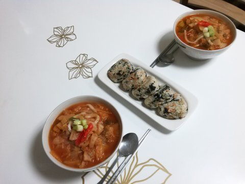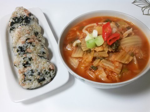 김치우동과 스팸주먹밥입니다.
