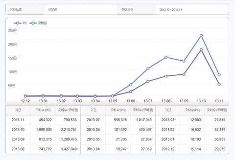 시우민 네이버 검색 조회수야. 일년 단위로 갖고왔어.
