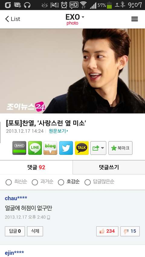 아까 네이버 메인에 뜬 찬열이 사진에 베댓이 되었었답니다.(뿌듯)