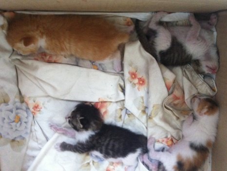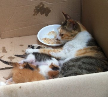 집앞에 새끼들을 물고 왔어요. 너무 힘이 없었던지 두 마리는 박스 주변에 떨어뜨려 놓고