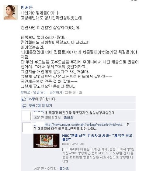 저 분은 진짜 말이 심하다. 해명도 " 친구들 보라고 그런건데 " 이런식이시고 친구들 보는거면 한 나라의 대통령이고, 같은 여성에게 몸 팔라는 말을 쉽게 할 수 있을까; 이왕하는김에 박근혜가 저 여자 고소해줬으면 좋겠다. 표현의 자유가 밑도끝도없잖아.