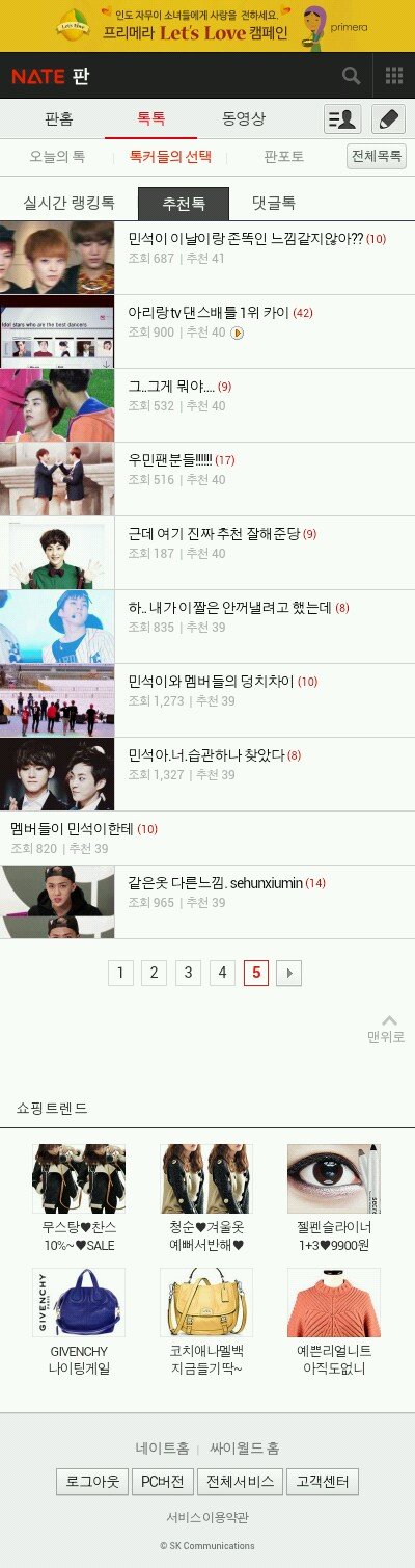 네이트판 왜저래 싹다 엑소야 진짜 우리는 인기 톡 채널도 못되게 하려고 자기 오빠 게시판이나 만들어서 즐찾하고 아진짜 싫어; 운영자가 이럴려고 팬톡 만들어줬나? 진짜 신고하고 싶다 좀 없애달라고 기분나빠 맨날 팬톡 베플은 다 엑소고 기분나빠 죽겠네 팬톡은 니들때문에 만들어준거 아냐 타팬덤 한테는 양보도 못해? 맨날 도배나 하고 짜증난다 네이트판 끊어야지 신발; 더이상 이꼴 못봐 신고도 하고 끊을꺼야.