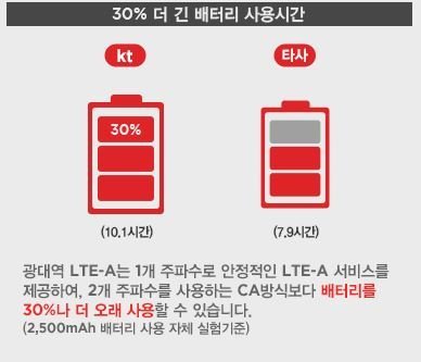 KT광대역은 부대찌개에 라면이나 햄사리를 넣어 전체적인 양이 많아지는 사리추가처럼, 서로 인접한 두 개의 주파수를 붙여서 하나의 넓은 주파수로 사용하는 기술이고, 타 통신사는 마트에서 흔히 보는 1+1처럼, 떨어진 두 개의 주파수를 CA라는 기술로 묶어서 마치 붙어 있는 것처럼 넓게 사용하는 기술입니다. 그러니까 KT가 속도를 안정적으로 빠르게 제공할 수 있는 거죠~ 근데 이런 기술이 배터리 소모에 영향을 준다는 사실 알고 계신가요?