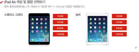 올레닷컴에서는 LTE 서비스가 가능한 와이파이 + Cellular 모델을 제공하고 있는데요. 16GB, 32GB, 64GB, 128GB 등 다양한 데이터 용량과 스페이스 그레이 및 실버색상 중 본인의 취향에 맞게 색상을 선택하신 후, 색상 선택 다음에 개통하시면 됩니다. 저는 실버가 조금 더 끌리네요. ㅎㅎ