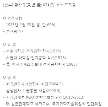 무엇보다 황창규씨가 KT 차기 회장으로 적절한 것은 삼성전자에서 사장을 역임한 적이 있는 전문경영인 출신에, 전자학을 전공하면서 IT분야의 이해력이 좋다고 합니다.