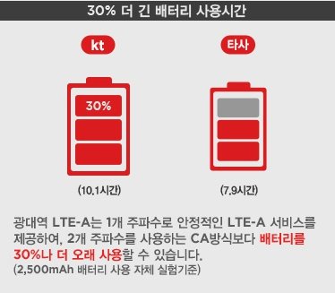 진짜 황금 주파수네요~ 하나의 주파수를 사용하는 KT는 2개 주파수를 사용하는 타사의 방식보다 배터리를 무려 30%나 더 사용할 수 있다니!