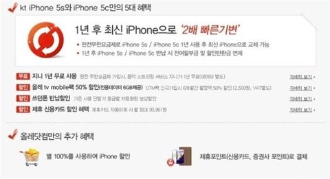 2개빠른 기변땜에 kt로 개통했는데 1년후에 잔여할부금 위약금 없으니까 바로~ 아이폰6 나오면 또 갈아탈수 있겠어요~ 지니 스트리밍 1년도 주고~ 올레 tv 모바일팩도 50% 할인주고~ 좋네요 ㅋㅋ올레티비는 한달 써보고 괜찮으면 계속 쓸까해요 우선 한달만 ㅋㅋㅋ 혹시 kt 쓰시는데 별 많으시면 kt 올레닷컴에서 바꾸시길! 별 사용 되니까요~ 전 번호이동이라 암것도 없었지만 ㅋㅋ kt에서 아이폰만 써온 제 친구는 무려 별이 50만개나 있어서 완전 싸게 샀어요 완전 배아픔요 ㅠㅠㅠㅠㅠㅠㅠㅠㅠㅠ 꼭 별 없어도 KT 올레닷컴에서 LTE 요금제로 가입하면 아이폰5S, 아이폰5C 둘 다 13만원 할인들어가요~