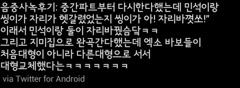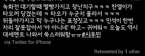나같아도 눈앞에 있으면 올~ 대세 시우민~~ 이러고 장난치겠다. 그럼 떽떽 쓰읍쓰읍 해줄것같아서. 아니면 아 그거 우월 그만 쫌 해요~ 그럼 경수 말 못해~ 했던것처럼 찡찡 거려줄것 같아. 그리고 시우민판 걱정하는 이쁜웅녀들 맘 이해하지만 시우민판 중심에서 시우민을 외치겠다는데.. 시우민판에서 시우민이 젤 멋지다. 대세다. 라고 왜 말을 못하냐고. 엑소판에서 외친것도 아닌데. 또 공방가면 엑소 멋지다. 엑소 잘생겼다 이러지않고 멤버들이름 부르면서 장난 많이쳐. 수호 멋지다. 세훈 잘생겼다. 등등. 대세를 대세라고 말 못하고 눈치봐야하나. 올해 머글킹. 영업왕. 대세남 맞자나. 시우민판에서 시우민 우쭈쭈 좀 하자 즐겁게.