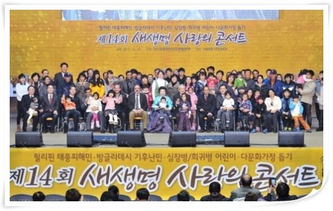 그 사랑의 손길 가운데 지난 12월 15일에는 사랑 위에 노래를 더한 ‘제14회 새생명 사랑의 콘서트’를 개최하게 되었습니다. 잠실 학생체육관을 가득 채운 6000여명의 회원들과 각계 각층에서 활동하는 정치, 경제, 관계, 법조계 초청 인사들과 연예인과 운동스타들도 함께 해주어서 이날 후원행사에 수급자로 참여한 35가구의 다문화가정에도 많은 웃음과 행복을 나눠주었습니다.