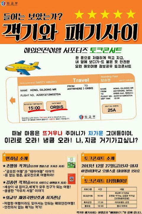 2. 김종현 작가님 - 카우치 서핑의 기본서 <카우치 서핑으로 여행하기>의 저자 김종현님의 생생한 "카우치 서핑" 이야기 - 돈 없어도 세계여행이 가능한 "카우치 서핑 여행법" : 세상이 내 집이고, 세계가 모두 친구가 되는 여행! *카우치서핑: 여행하고자 하는 곳의 현지인의 도움을 받아 무료 숙박 및, 운이 좋다면 가이드까지 받을 수 있는, 여행자들을 위한 비영리 커뮤니티. 숙소의 교류와 동시에 이루어지는 문화의 교류가 카우치 서핑의 목적. 3. 외교부 재외국민보호과 서기관님