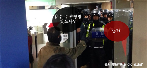박근혜 정권은 법리를 제멋대로 해석하여 압수수색 영장 없이 신문사가 있는 건물을 강제로 훼손하고 시민을 연행하는 만행을 저지른 것입니다.