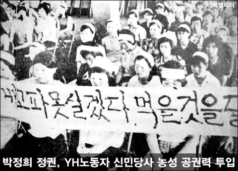1979년 8월 9일부터 서울 중랑구 면목동에 있는 YH무역 노동자 200여 명은 회사 측의 부당한 폐업 공고에 반대해 시위를 벌입니다. 그들은 창립자인 장용호가 정부의 수출 지원책에 힘입어 대기업으로 성장하면서 외화를 빼돌리는 등 무리한 사업확장을 하다 회사가 어려워졌다고 정부에 호소했습니다.