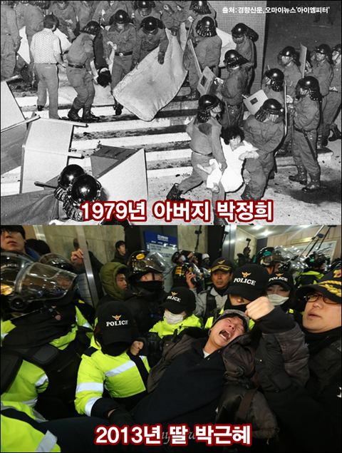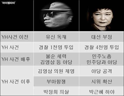박정희의 'YH노동자 신민당사 농성 강제 연행'과 박근혜의 '민주노총 강제 진입'은 굉장히 유사합니다. 두 정권 모두 '유신 독재'와 '대선 부정'으로 정통성을 위협받았습니다. 또한, 단순한 노동쟁의 등의 사건에 수천 명의 경찰을 투입해 강제 해산과 진입을 시도했습니다.