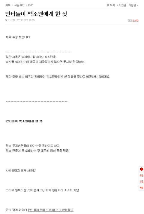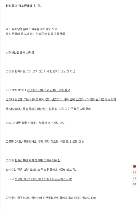 제가 글을 쓰는 이유는 안티들이 엑소팬들에게 한 짓들을 말하고 비판하려 함이에요.