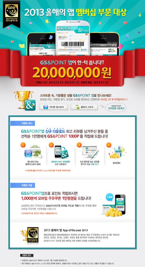GS&POINT 앱이 2013 올해의 앱 대상 타서 진행하고 있는 이벤트인데 경품이 총 2,000만원.