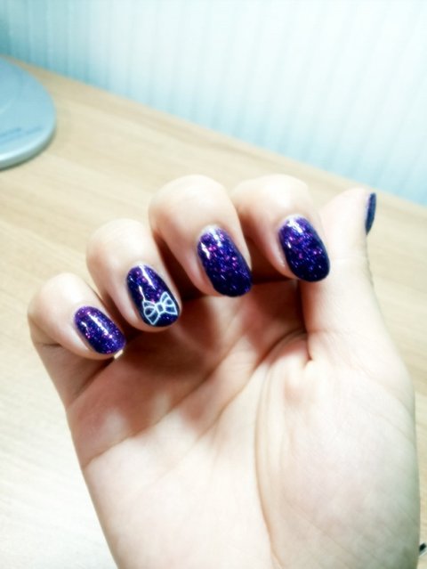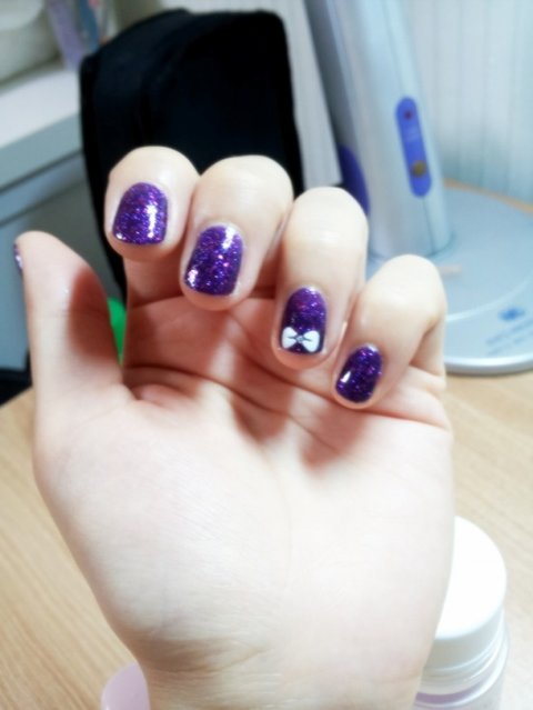 이건 보라색 펄?? 감있는 매니큐어에 리본 스티커 붙여줬어용 ㅋㅋㅋ