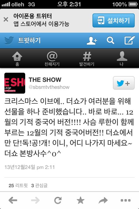 오늘 더쇼에서 중국어버전 12월의 기적한대!!