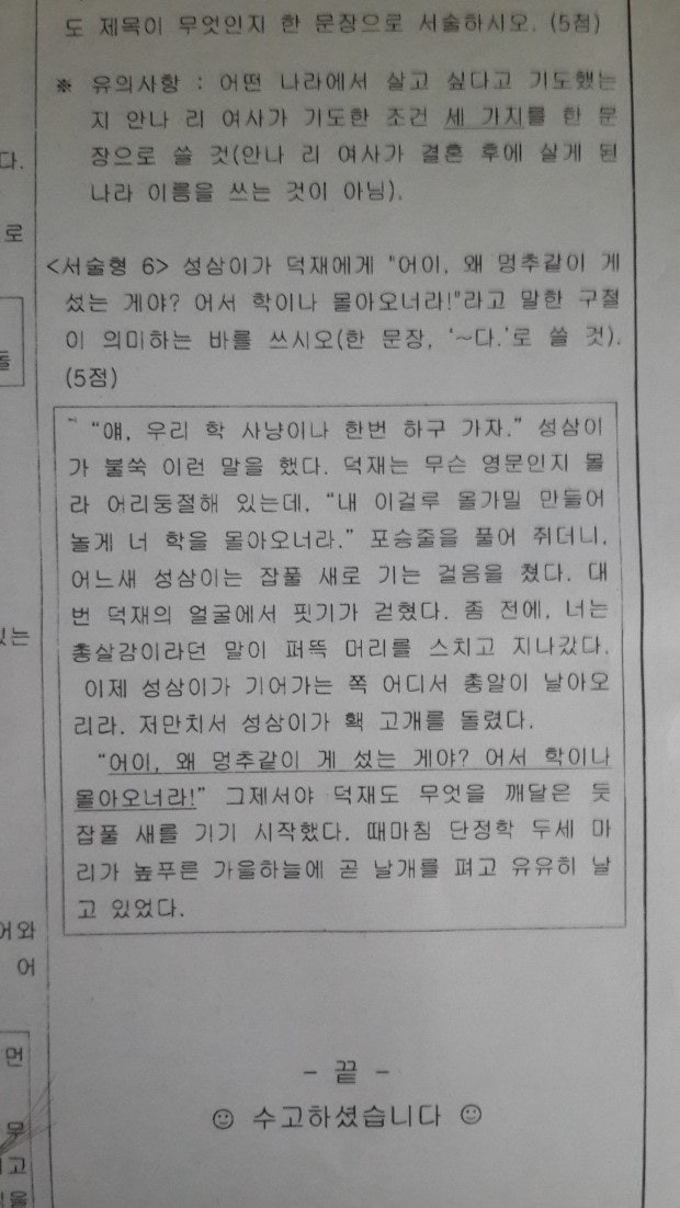 그런데 이번 기말고사에서 낸 문제는 주인공이 한 말에 대한 의도를 쓰는 것이 었습니다.