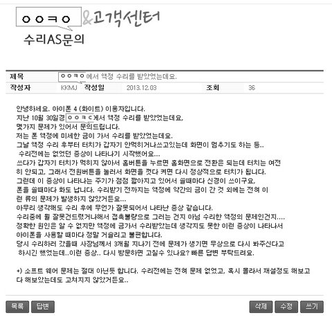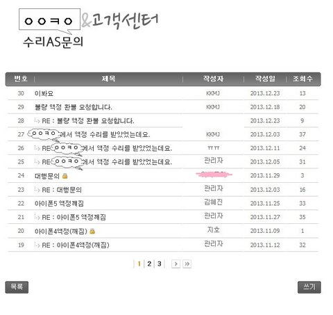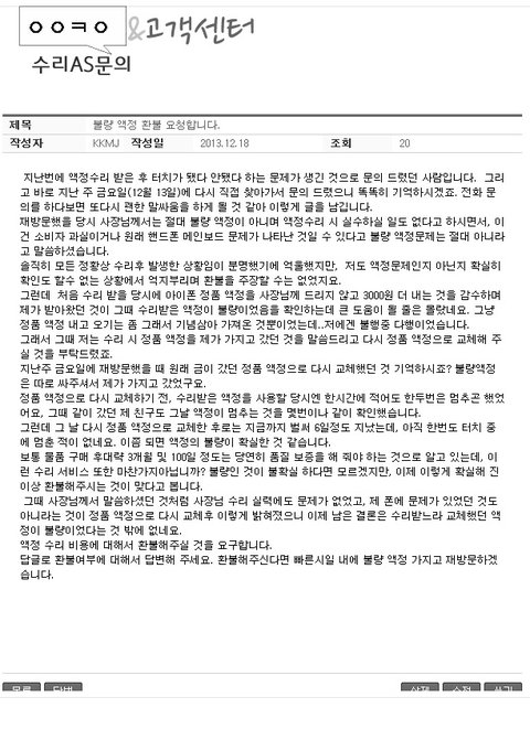 그래서 업체 홈피에 불량 액정 수리에 대한 환불 요청글을 남겼음.