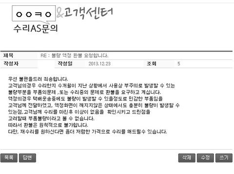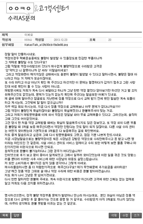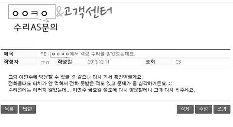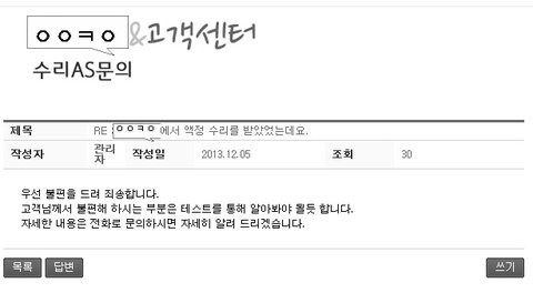 그래서 수리후 한달 정도가 지난 12월 초에 홈페이지에 문의글을 남겼고,