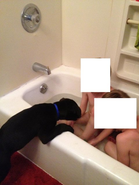 욕조 안으로 들어가려는 맥스. (조카들 얼굴은 가렸음).