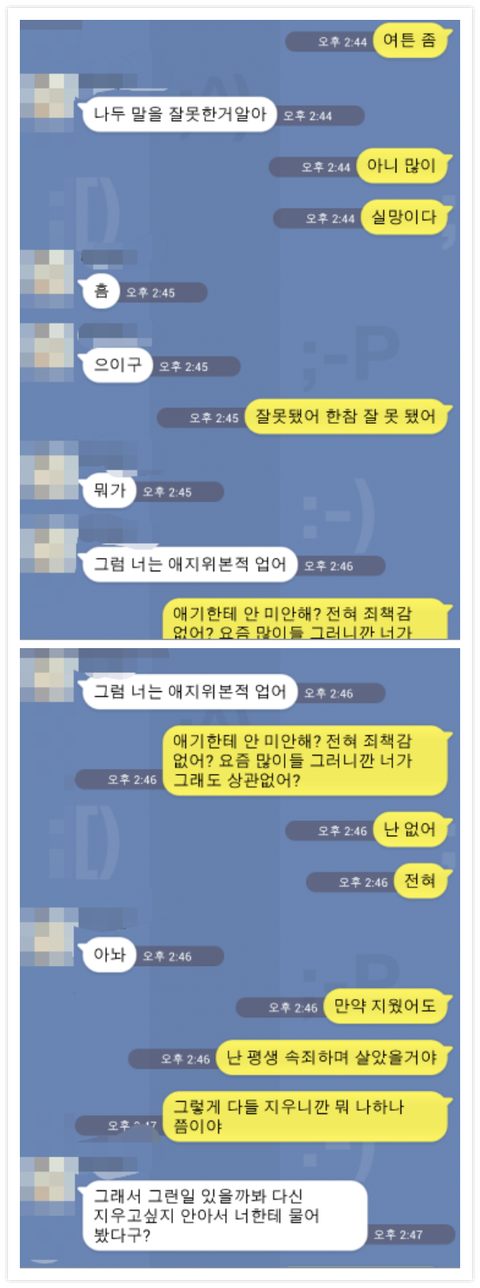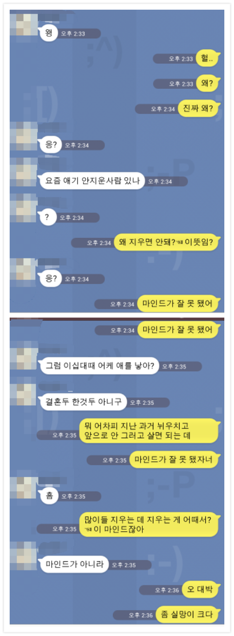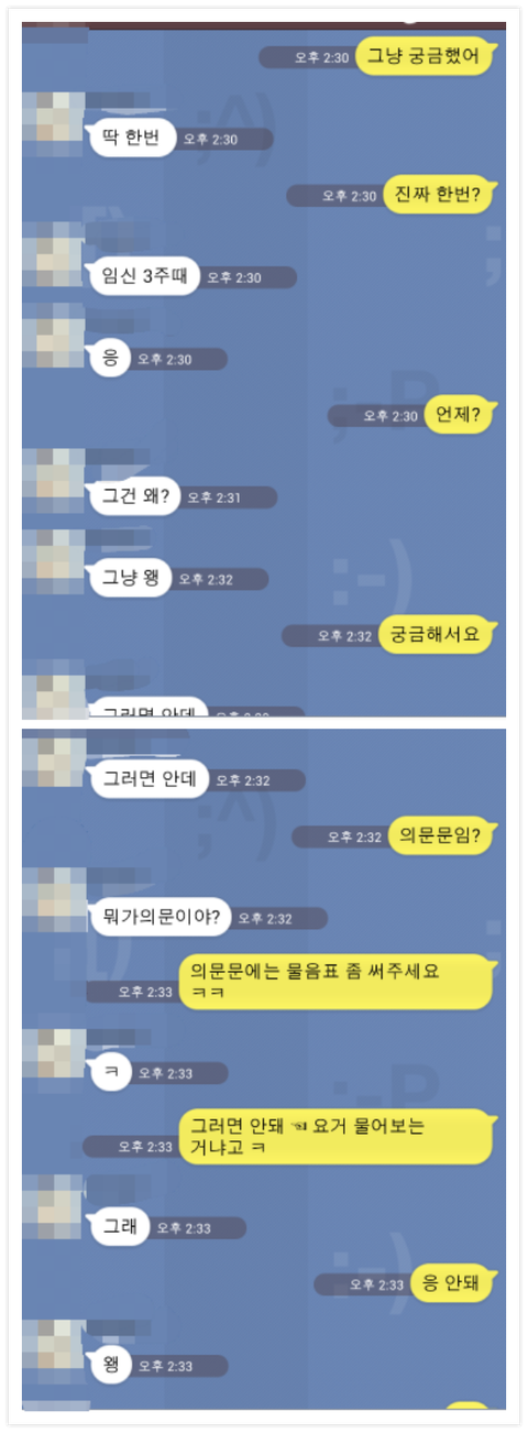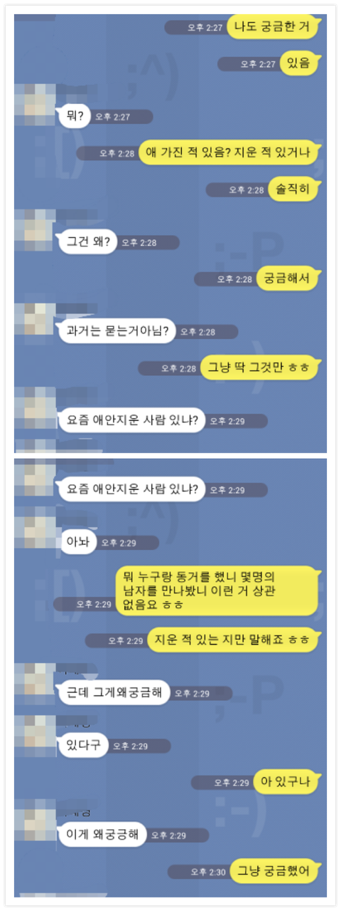 안녕하세요 가끔 톡을 보는 20대 후반 직장인 남잡니다 최근에 만나는 분이 생겨서 잘 만나고 있었는 데 뜬금없이 궁금한 게 있다고 하더군요 그러면서 나온 말이 만약 임신하면 어떻게 할거냐고.. 이런 얘기가 오가는 도중 갑자기 저도 궁금한 게 생겨서 물어 본 말이 있는 데.. 이 후부터는 카톡 내용을 첨부할게요