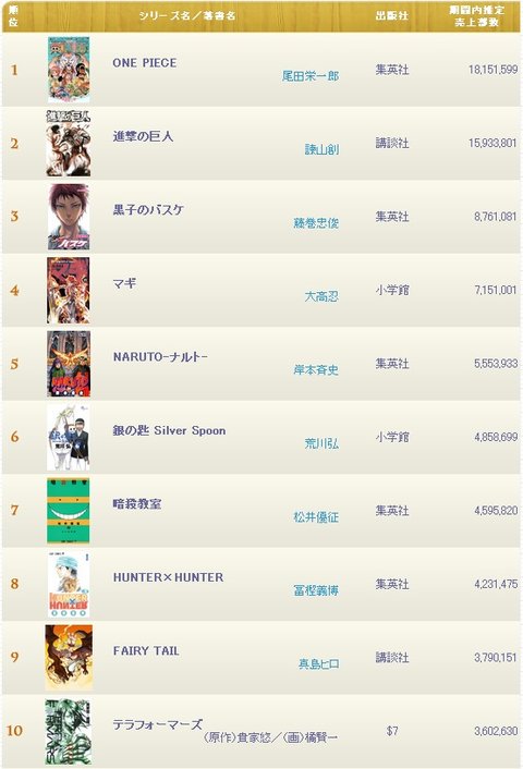 4위인 마기는 판타지 만화로서 주인공인 알라딘 신밧드, 알리바바등이 주인공인 광대한 사막을 배경으로 펼쳐지는 모험과 우정의 이야기라고 한다.