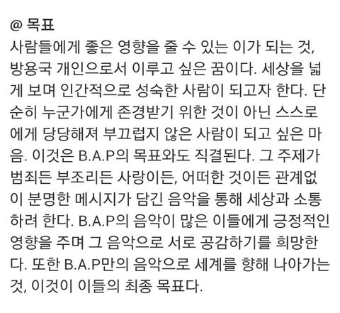특히 좋은 영향을 줄 수 있는 사람이 된다는 것과 분명한 메시지가 담긴 음악을 통해 세상과 소통하려는 것과 B.A.P음악이 많은 이들에게 긍정적인 영향을 주며 그 음악으로 서로 공감하기를 희망한다는 부분.