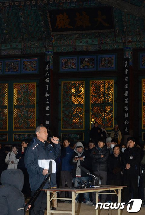 ▲ 경찰의 체포영장 집행을 피해 은신 중인 박태만 철도노조 수석부위원장이 25일 서울 종로구 견지동 조계사에서 기자회견을 갖고 입장을 밝히고 있다.박 수석부위원장은 "불교뿐만 아니라 전체 종교계에도 호소를 드리고 파업사태가 하루빨리 해결되도록 도와달라고 요청할 것"이라고 말했다. ⓒ 뉴스1