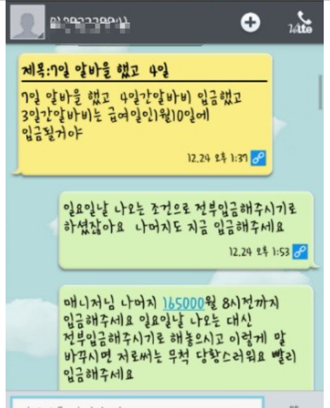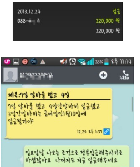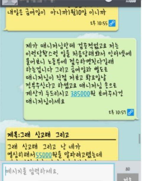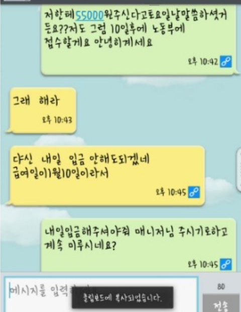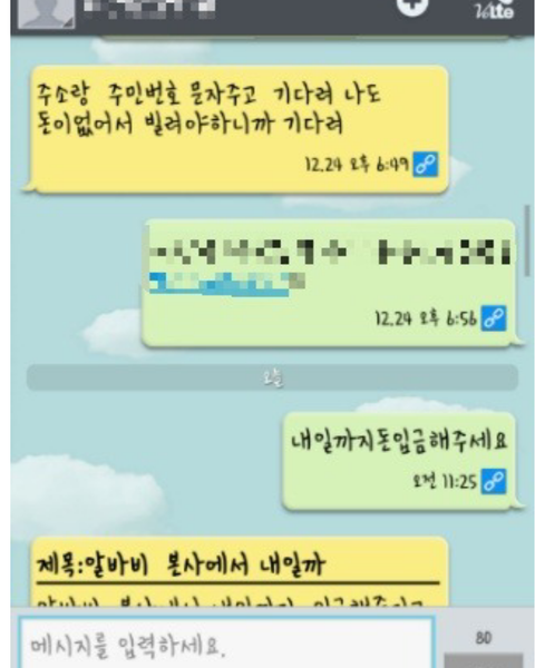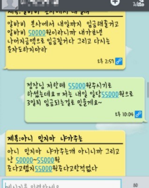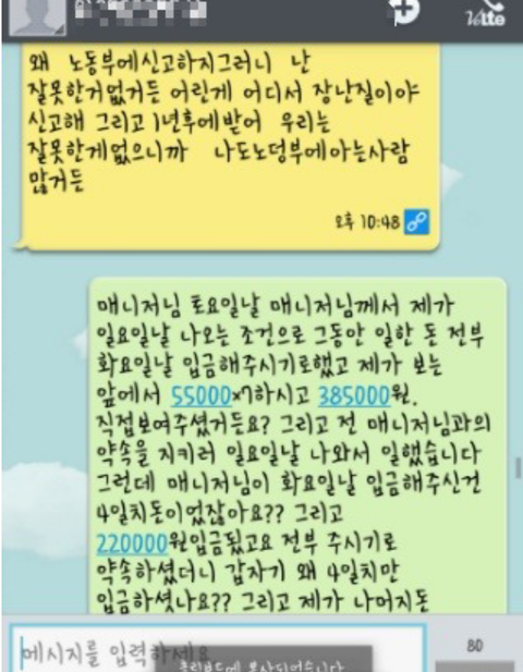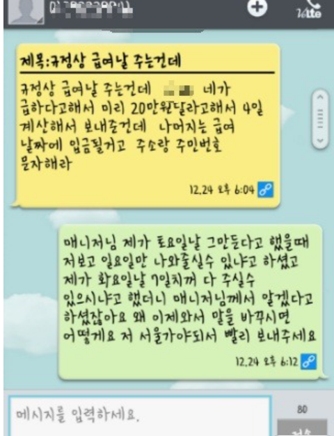 그러고 화요일날이 되자 4일치 알바비만 입금이 되었습니다. 당황스러운 나머지 매니저님께 문자를 드렸더니 갑자기 나머지는 월급날 들어온다는 것입니다,