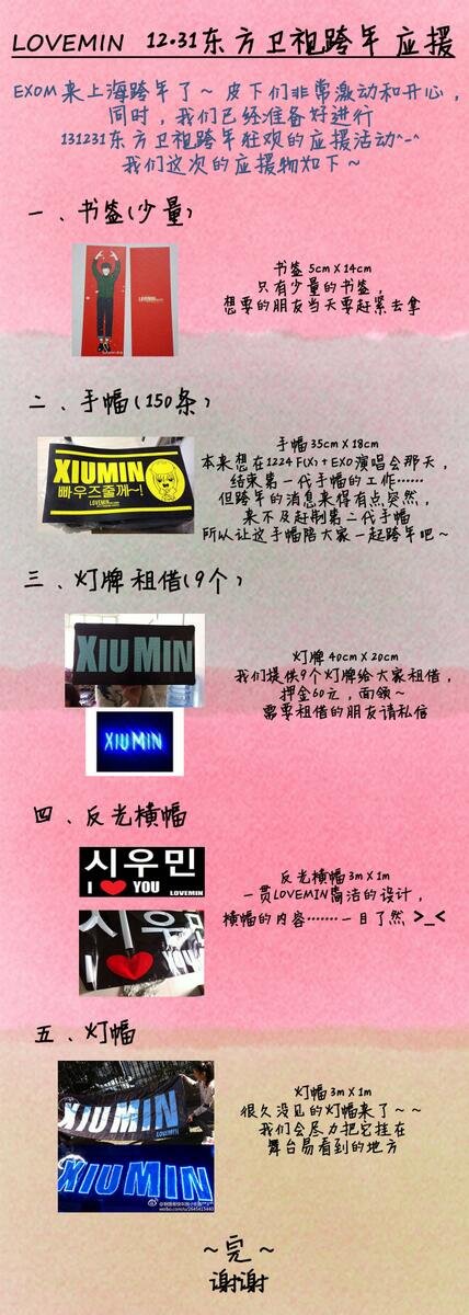 LOVEMIN @LOVEMIN_XIUMIN 저희가이번상해동방위성새해맞이 프로그램에 전광판,현수막,현수막식 전광판으로 응원하기로 했어요또한 책꽂이,슬로건도 배포예정이에요.그날 저희가 트윗으로 시간과 장소를 알려드릴테니 받아가실 분들은 수시로주의하시길바래요