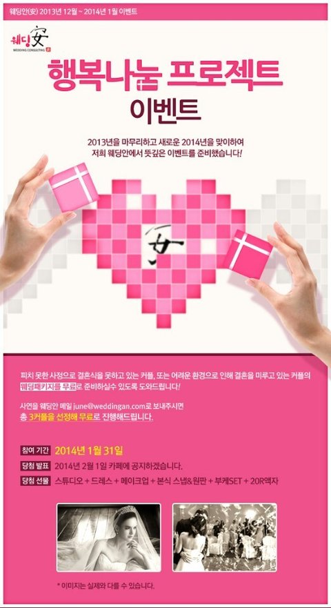 저희 웨딩안에서 2014년을 의미있게 맞이하고자 뜻깊고 마음 따뜻한 이벤트를 준비하게됬습니다.