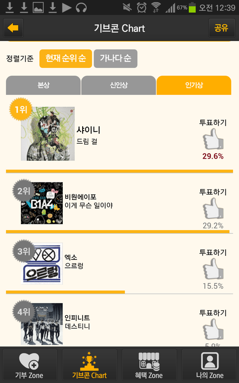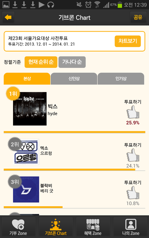 서가대기브콘어플깔고 본상 인기상 투표좀해줘ㅠㅠㅠㅠ 한달도안남앗는데 본상은 2위고 인기상은 3위.. 우리엑소꼭상받게해주자!