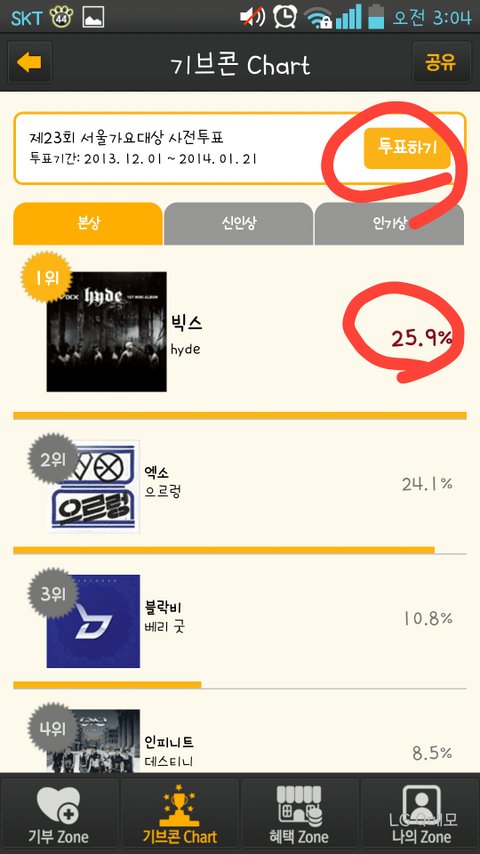 플레이어스토어에서 서울가요대상기프콘 쳐서다운받아서 빅스투표해주세요 저엄청했죠ㅋㅋㅋㅋㅋㅋㅋㅋ힘들어요ㅜ(뿌듯)