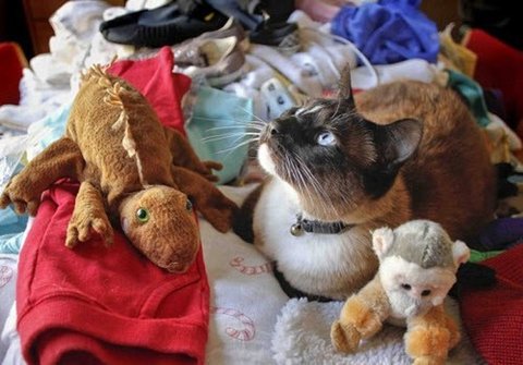 [문제의 고양이 '더스티' 자신들이 훔쳐온 인형들 속에서 노니고 있다]