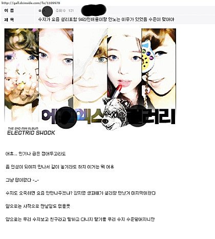 왜굳이에프엑스갤러리에이런글을쓰는건지이해도안되고수지가얼마나인성이좋든간에굳이에펙스갤러리에서이지랄을하는거냐