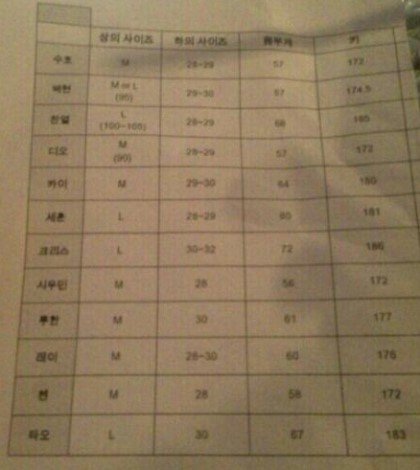 엑소 신체사이즈