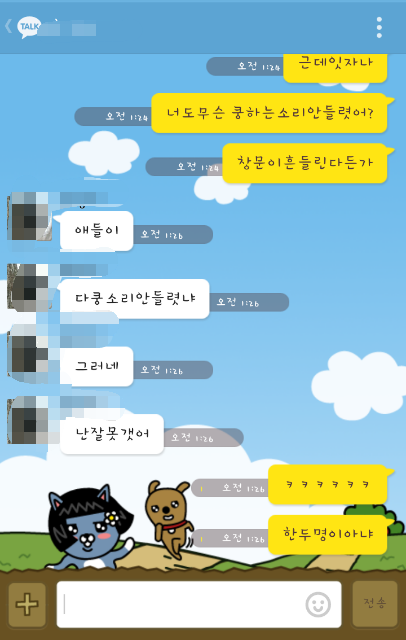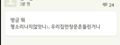 근데 베란다밖으로 쿵 하는소리가들리더라구요? 그리고 폰하는중이라서 자세하보진못했지만 창문이 살짝 흔들렸던것같았어요