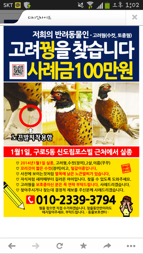 저의 지인분이 새끼때부터 자식처럼 키워온 애완꿩을 찾고있습니다..꼭 도와주십시오ㅠㅠㅠ