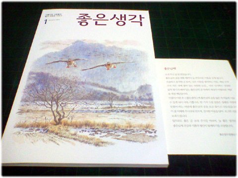 월간 좋은생각의 표지가 새해부터 변화가 생겼다. 그동안 사진이었던 것이 그림으로 바뀌었다. 선명하고 깔끔한 사진에 비해 한결 여유와 정감이 느껴져 좋다. 생태 화가 이태수씨가 그린 그림인데 함께 쓰여진 글을 옮겨본다.
