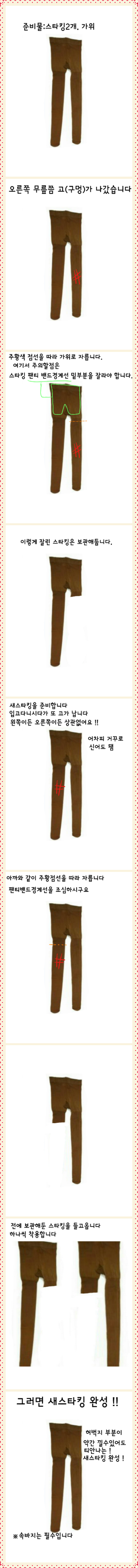 제가 직접생각한건데 다른분이 말하셨을수도 있겠네요ㅠ 근데 이렇게 하시는분들 몇몇분은 있으실거라고 글적어놨듯이 ~ 팬티스타킹 이라는게 올이 잘 풀리고 얇기때문에 많은 분들이 아까워하고 어떻게하면 다시 입을수 있을까 라는 생각을 하셨기 때문에 저와 같은 방법으로 예전부터 쭉 입으셨다고 생각합니다. 모방한건 아니에요ㅠ 중학교1학년때