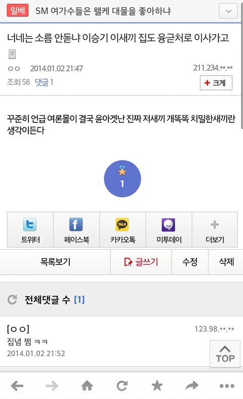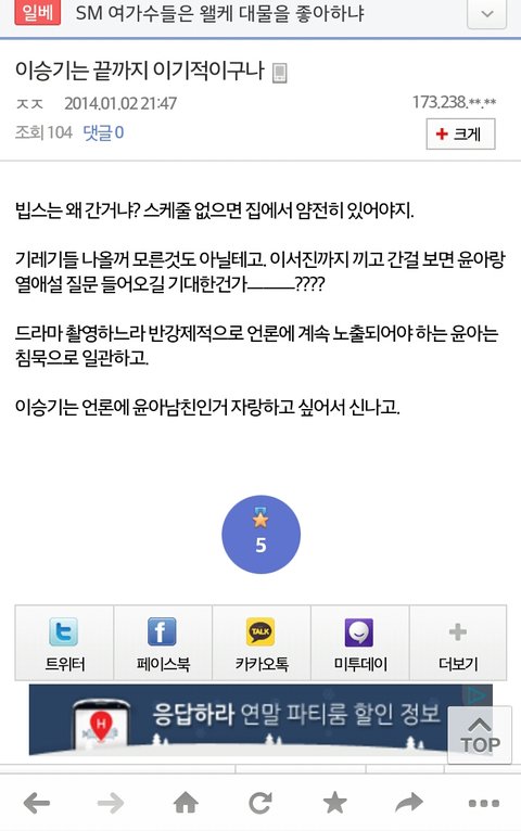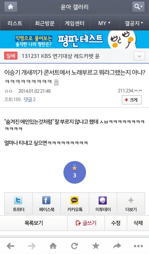 병신아ㅋㅋ애초에디씨글을왜가져와?진짜병신이냐?디씨자체가어떤곳인지몰라?윤아연애설터지자마자태연갤러리,윤아갤러리,제시카갤러리등등 소녀시대멤버들갤러리에안티들 존1나많이들어와서 이상한글쓰고갔어 윤아텐미닛글들도다 윤아안티가쓴거고추천도안티들이해서 개념글올라가게한거얔ㅋ그리고저기 순위안에있는개념글 윤아사진다지웠다저런글 안티가쓰고안티가추천해서 올라가서욕오질라게먹고내려간글이거든?ㅋㅋ윤아갤러리눈팅5분만해도팬들어떤반응인지알텐데 다들쿠크깨지고속상하다 뭐이런반응은해도 임윤아텐미닛하자 소시앨범다버렸다 이딴글없어병신아;악의적으로캡쳐해오지마 융갤자체가 딴갤보다청정한편이여서 좋은글도많은데 왜안티들이쓴저딴글가져와서니맘대로지랄이야 융갤글은안쓰고눈팅맨날하는데 설마너가 융갤에서계속윤아욕하면서어그로끌던그년이냐?;이상황에디씨글가져와서 팬들반응~이러는애도있구나..와ㅋㅋ