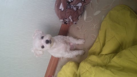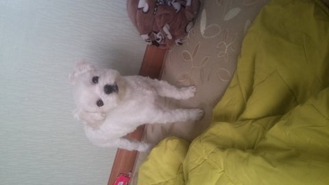 특징은 흰색털에 후드티를 입고, 분홍색 가슴줄을 하고있엇습니다.